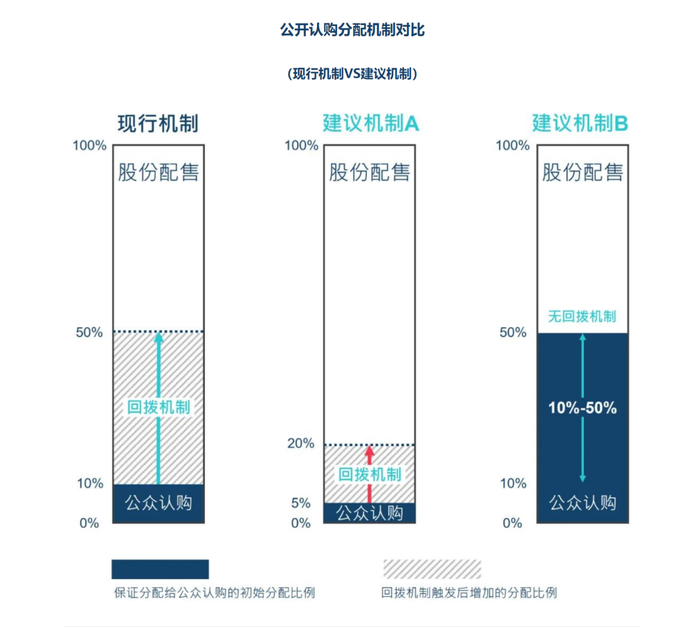 结合市场声音和其他国际交易所的安排,港交所在咨询文件中建议了两套方案供上市公司选择:一种是将公开认购的初始分配份额设定为5%,回拨上限为最高20%;另一种则是将公开认购的初始分配份额设定为10%—50%之间,无回拨机制。上市公司在招股时可以从上述方案中二选一。例如,如果有一些大众熟悉的公司希望把新股多分配一些给散户,可以选择第二种方案,将初始分配给公开认购部分的股份设定为50%。