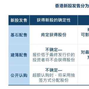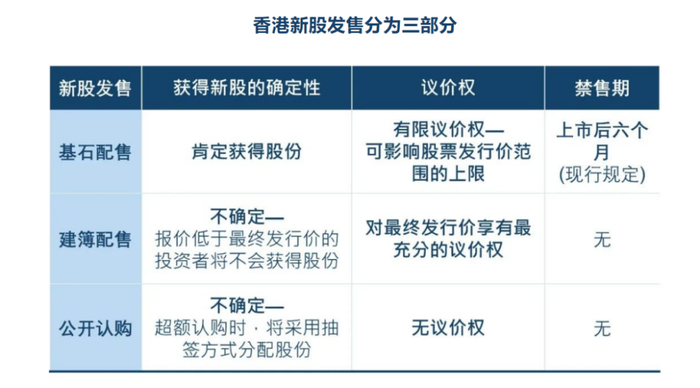 港股新股发售通常分为基石配售、建簿配售和公开认购三个部分。其中,基石配售部分卖给发行人在公开招股前已经选定的基石投资者;建簿配售部分主要卖给机构投资者和专业投资者;公开认购部分主要卖给散户投资者。