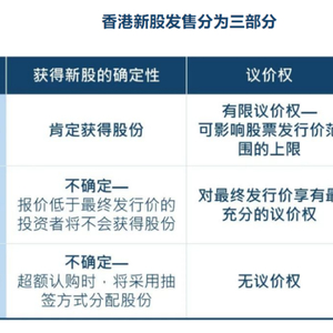 港股新股发售通常分为基石配售、建簿配售和公开认购三个部分。其中,基石配售部分卖给发行人在公开招股前已经选定的基石投资者;建簿配售部分主要卖给机构投资者和专业投资者;公开认购部分主要卖给散户投资者。