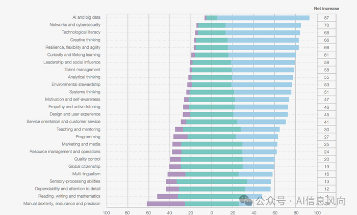 在技能需求方面,人工智能、大数据和网络空间安全等领域的技术技能需求预计快速增长,而创造性思维、韧性、灵活性和敏捷性等人类技能依然至关重要。未来,两者的有机结合将成为许多增长岗位的必备要求。