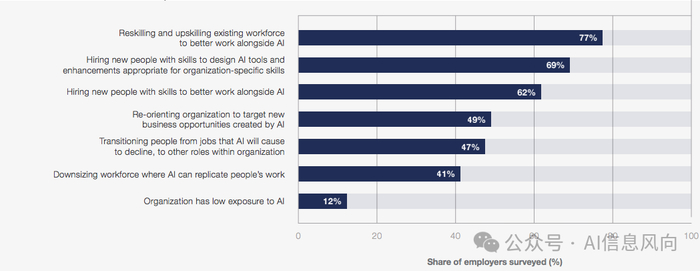 地缘政治形势紧张,34% 的受访企业表示担忧,贸易限制和产业政策转变影响更多企业,部分企业通过离岸外包和企业回流战略应对,这也增加了对网络空间安全等技能的需求。