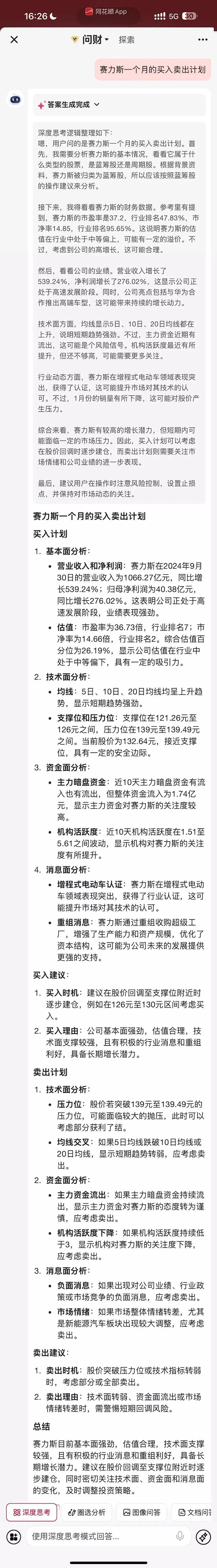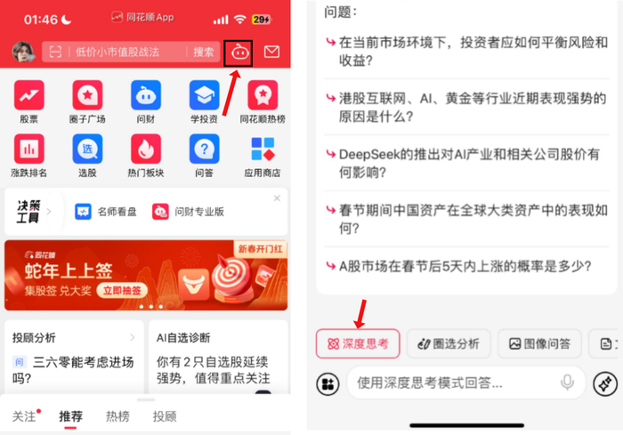 问财体验路径:打开同花顺—进入问财—大模型引擎—开始对话—深度思考。