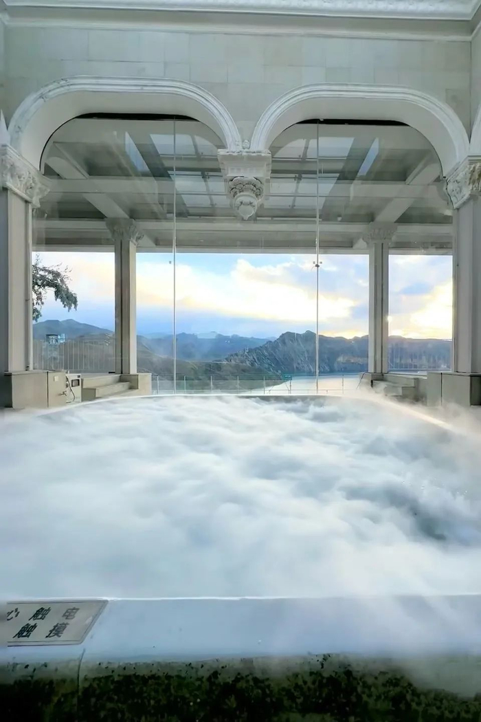 咖啡厅正中间有一个巨大的水雾池,当水雾慢慢飘散开,举起手机,咔咔出片。