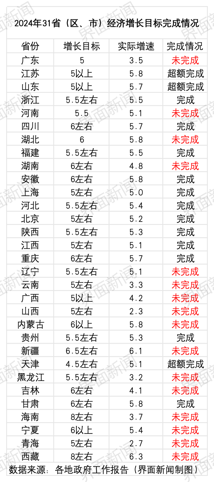 从地方公布的“成绩单”来看,2024年,地方经济减速换挡的特征比较明显。31个省份中,12个省份基本完成了年初的目标,3个省份超额完成了经济增长目标,而其余16个省份则没有完成年初设定的目标。