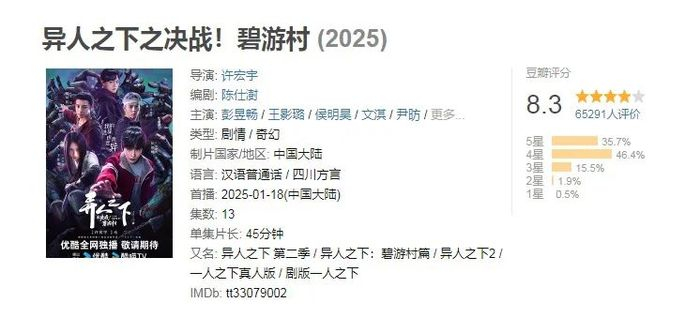 另一方面,开年至今,优酷方面也迟迟没能跑出一部具有强大竞争优势的剧集项目。委以重任的《异人之下之决战!碧游村》虽做到了不负期待,豆瓣口碑比前作还上升了0.2分,但受众辐射范围依旧没能有效突破圈层,而该系列的下一部《异人之下之血战唐门》又到了腾讯视频的手中。