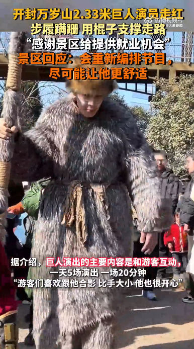 据介绍,巨人演出的主要内容是和游客互动,一天5场演出,一场20分钟,步履蹒跚,用棍子支撑走路。