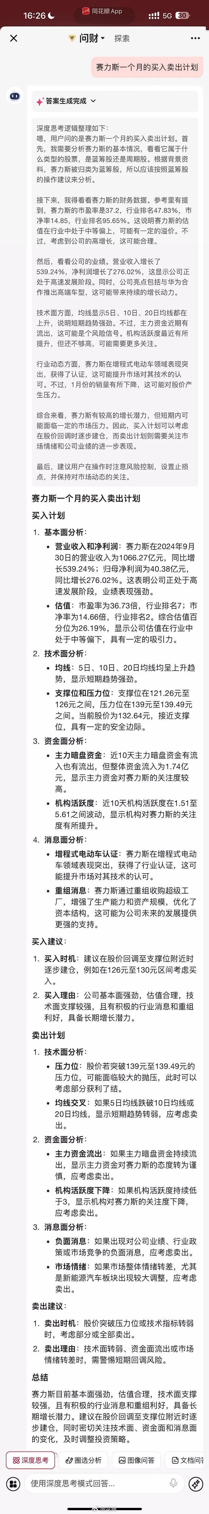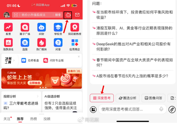 APP版:打开同花顺—进入问财—大模型引擎—开始对话—深度思考