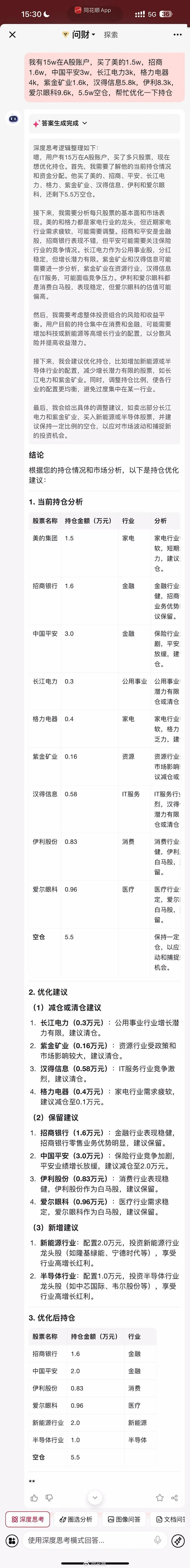 案例二:我有15w在A股账户,买了美的1.5w,招商1.6w,中国平安3w,长江电力3k,格力电器4k,紫金矿业1.6k,汉得信息5.8k,伊利8.3k,爱尔眼科9.6k,5.5w空仓,帮忙优化一下持仓