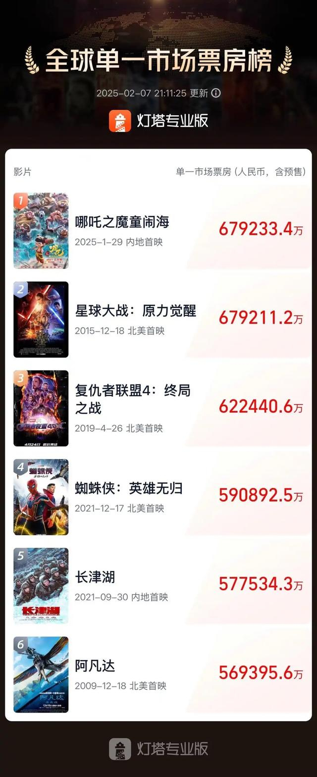 2月7日晚,国产动画电影《哪吒之魔童脑海》(简称《哪吒2》)再度传来捷报,以67.922亿元票房(含预售),超越《星球大战:原力觉醒》,继登顶中国影史票房榜后,又成功问鼎全球单一市场票房榜。这一成就不仅彰显了中国电影工业的崛起,也引发了全球影迷的热烈反响,外国网友纷纷表达对观影的迫切期待。