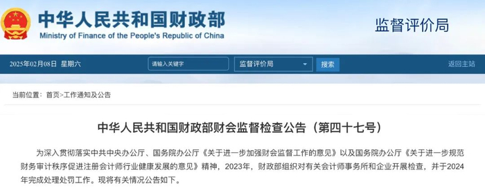 2月8日,财政部发布财会监督检查公告,涵盖2023年财政部组织对有关会计师事务所和企业开展检查,并于2024年完成处理处罚工作的有关情况。