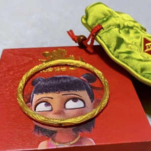 在电影里,乾坤圈这一黄金打造的镯子,是哪吒从小佩戴的首饰,同时也是他常用的武器之一,2020年某黄金品牌与《哪吒1》联名推出了复刻版的足金首饰周边。“当时买的60克左右的黄金手镯,加上工费一共花了2.8万元。”王女士告诉记者,因为看到该手镯很美,有镂空、龙纹,还加了绿钻,于是就下手了。她看完《哪吒2》才发现,这款手镯是一比一还原的乾坤圈。