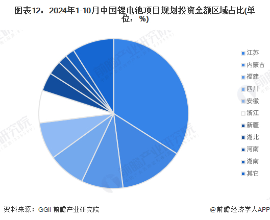 从锂电池规划建设项目区域分布来看,2024年1-10月,我国华东地区锂电池项目规划投资金额近千亿,占比近六成,位居榜首,其中投资金额集中在江苏省,规划投资金额近600亿元。