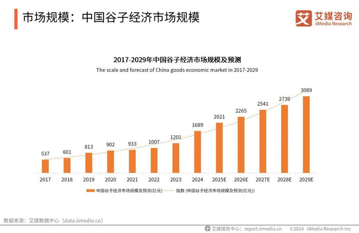 iiMedia Research(艾媒咨询)数据显示,中国谷子经济市场规模呈上升趋势,增长速度加快。2024年中国谷子经济市场规模达1689亿元,较2023年增长40.63%。艾媒咨询分析师认为,谷圈文化的兴起引发新的消费热潮,为谷子经济带来新的市场机遇,未来谷子经济市场将差异化繁荣发展。