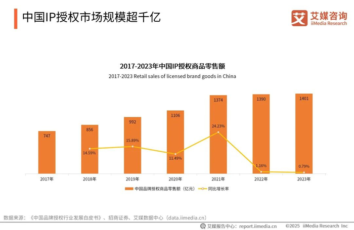 数据显示,2019-2023年中国IP授权商品零售额整体呈现上升趋势,其中2023年中国IP授权商品零售额达1401亿元,较2022年提高了11亿元。艾媒咨询分析师认为,随着中国IP的爆发,以及消费者需求的增加,授权商不断布局IP产品的开发,并通过授权改编、授权联动等方式进一步变现。