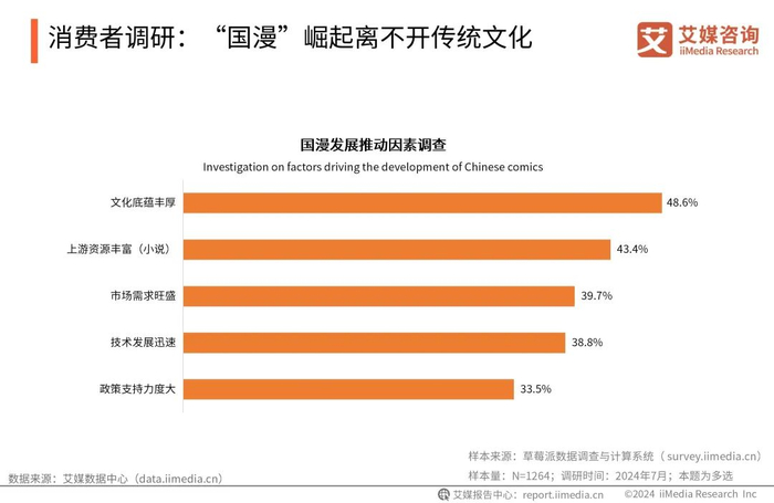 iiMedia Research(艾媒咨询)调研数据显示,受访者普遍认为文化底蕴丰厚及上游资源丰富推动了国漫的发展。作为国漫的两大故事源头,网文及网络漫画,因其生长于中文互联网语境,长期受中式思维和传统文化影响,不论故事瞄准东方奇幻还是武侠世界,总是带着独属于中国的精神品质。