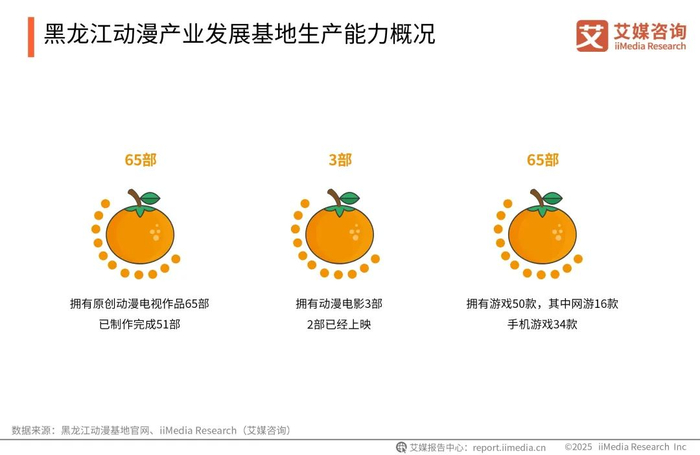 2024年,黑龙江动漫产业发展基地年动漫生产能力达30000分钟,拥有57项具有自主知识产权技术,年外包生产能力超过8000分钟,已先后为北京、上海、广州、宁波、福州等地20余家企业提供过外包服务,合作项目达100余个。基地拥有原创动漫电视作品66部,其中在央视播出的有13部;拥有动漫电影3部,其中2部已经上映;拥有游戏50款,其中网游16款,手机游戏34款。