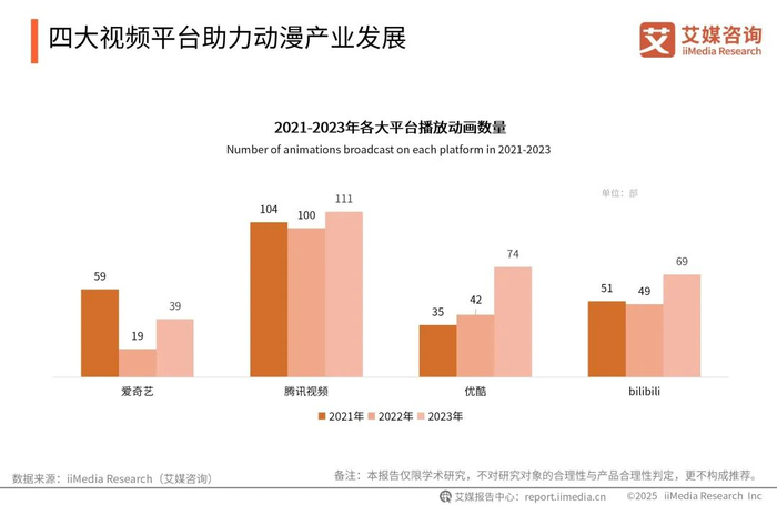 四大视频平台爱奇艺、腾讯视频、优酷、bilibili(后称b站)公布了2023年度动画片单,就数量来看,腾讯以111部数量遥遥领先,优酷、B站分别以74部、69部紧随其后,爱奇艺发布39部数量最少。