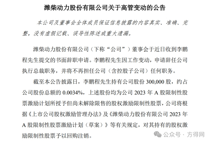 2025年1月10日晚间,潍柴动力发布关于高管变动的公告。公告显示,公司董事会于近日收到李鹏程先生提交的书面辞职申请。李鹏程先生因工作变动,申请辞任公司执行总裁职务,并将不再担任公司(含控股子公司)任何职务。