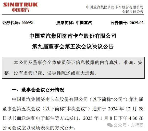 2025年1月9日,中国重汽集团济南卡车股份有限公司发布第九届董事会第五次会议决议公告。经与会董事充分讨论后,审议并表决的人事变动方面的议案有以下两个: