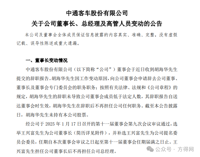 2025年1月18日,中通客车股份有限公司董事会(以下简称中通客车/公司)公布,公司董事会于近日收到胡海华先生提交的辞职报告。胡海华先生因工作变动原因,向公司董事会申请辞去公司董事、董事长及董事会专门委员会的职务职务。胡海华先生在辞职后不再担任公司任何职务。截至本公告披露日,胡海华先生未持有本公司股票。