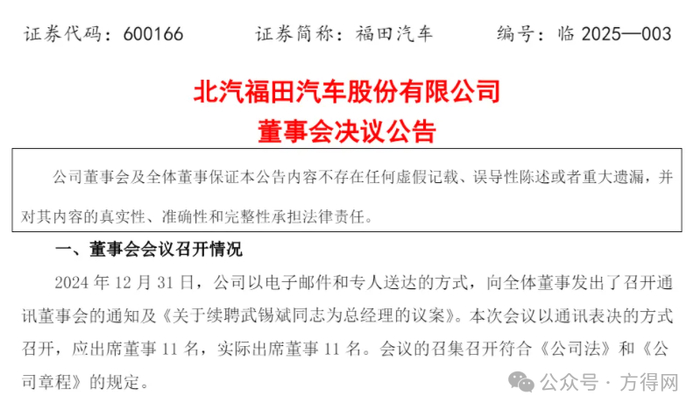 2025年1月18日,北汽福田汽车股份有限公司发布董事会决议公告。2024年12月31日,公司以电子邮件和专人送达的方式,向全体董事发出了召开通讯董事会的通知及《关于续聘武锡斌同志为总经理的议案》。本次会议以通讯表决的方式召开,应出席董事11名,实际出席董事11名。会议的召集召开符合《公司法》和《公司章程》的规定。