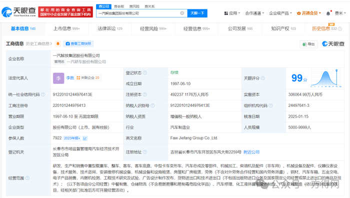 该公司成立于1997年6月,注册资本约49.2亿人民币,经营范围含研发、生产和销售中重型载重车、整车、客车、客车底盘、中型卡车变形车、汽车总成及零部件、机械加工、柴油机及配件(非车用)、机械设备及配件、仪器仪表设备等,由中国第一汽车股份有限公司、一汽奔腾汽车股份有限公司、国家制造业转型升级基金股份有限公司等共同持股。此前,该公司发布公告称,李胜辞去一汽解放总经理职务,接替吴碧磊担任一汽解放董事长,于长信由常务副总经理升任总经理。