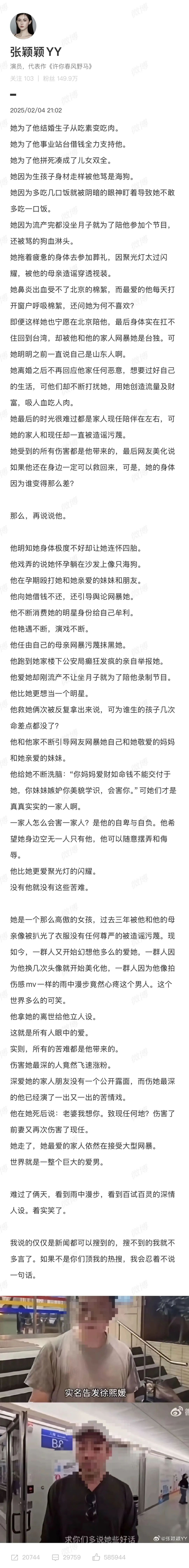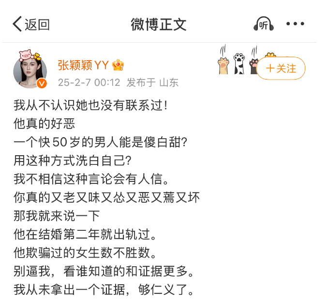 2月4日,张颖颖也曾发文,指责汪小菲在雨中漫步独自悲伤,是在卖深情人设洗白自己。“他拿她的离世给他立人设,这就是所有人眼中的爱,实则,所有的苦难都是他带来的。”