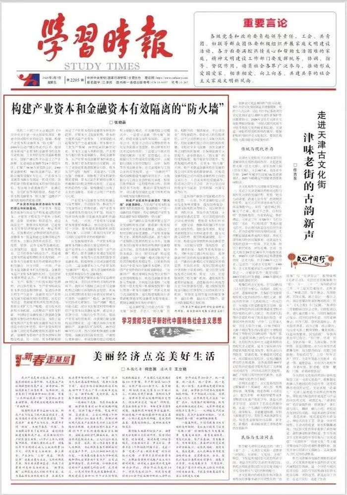 2025年2月7日,《学习时报》头版推出张晓晶教授文章《构建产业资本和金融资本有效隔离的“防火墙”》。