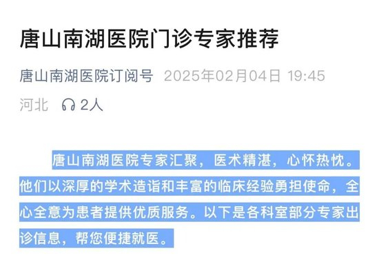 值得一提的是,媒体梳理发现,3天前(2月4日),唐山南湖医院官方订阅号还发布了门诊专家推荐一文,春节期间该院也是正常开诊。