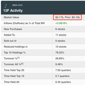 根据SEC最新披露的13F文件,截至2024年12月31日,景林香港公司去年四季度末在美股市场持有36只证券,合计持仓总市值为31.65亿美元,较三季度末的31.51亿美元增长约4.4%。