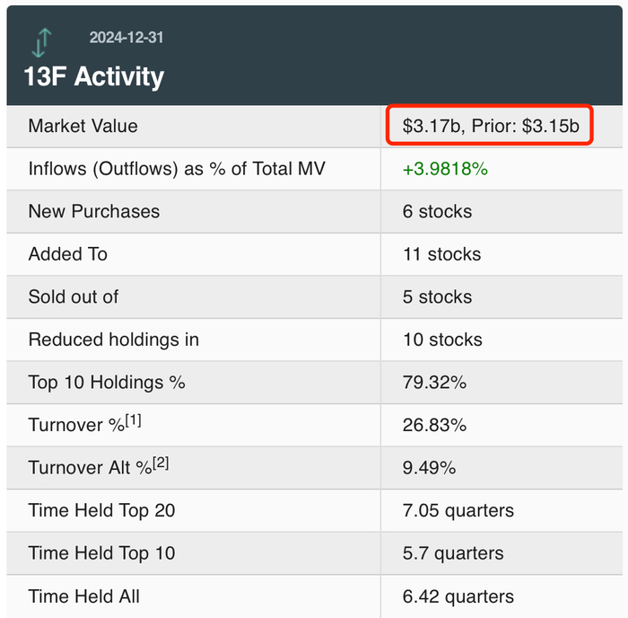 景林资产的海外子公司景林资产管理香港有限公司(GREENWOODS ASSET MANAGEMENT HONG KONG LTD,以下简称景林香港公司),近期向美国证券交易委员会(SEC)提交了截至2024年四季度末的美股持仓数据,其持仓总市值为31.65亿美元(约合230.69亿元人民币),较2024年三季度末有所增加。