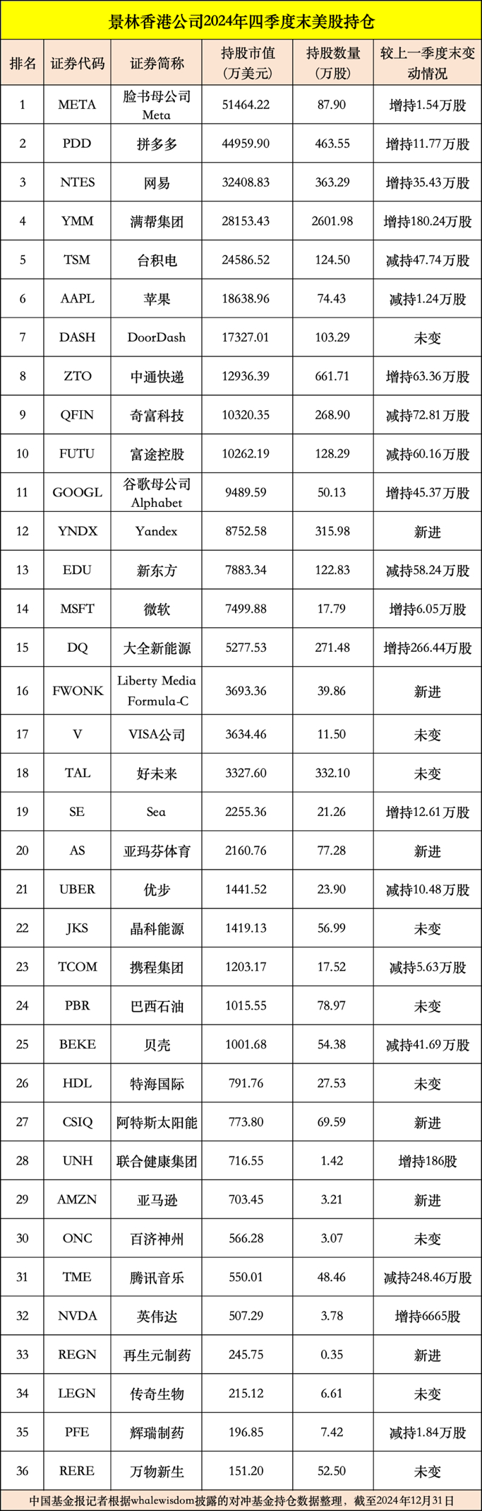 去年四季度,景林香港公司加仓了拼多多、网易、满帮集团、大全新能源等多只中概股,看好2025年中国资产的投资机会;同时加仓了脸书母公司Meta、亚马逊、谷歌母公司Alphabet、微软等;但是减持了台积电、苹果、新东方、腾讯音乐等;清仓了美光科技、爱彼迎、阿里巴巴等。