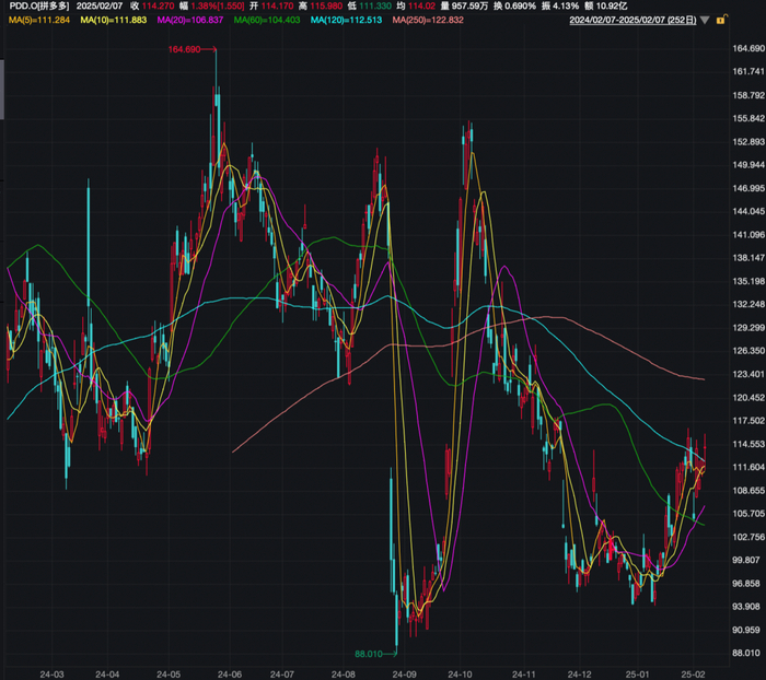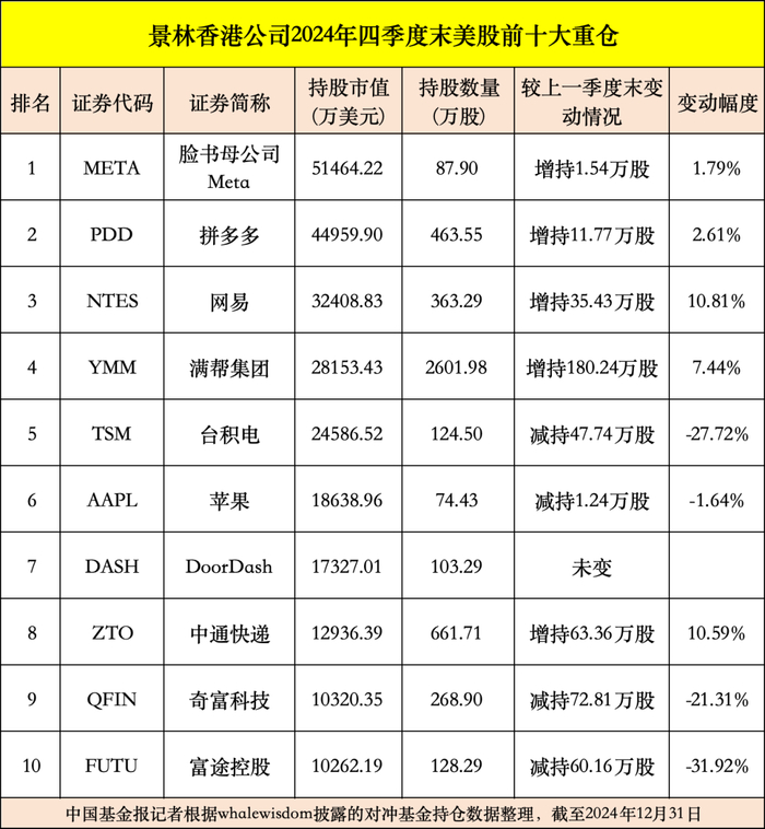具体来看,截至2024年四季度末,景林香港公司在美股市场的前十大重仓股分别是脸书母公司Meta、拼多多、网易、满帮集团、台积电、苹果、外卖平台DoorDash、中通快递、奇富科技、富途控股,合计持股市值为25.11亿美元,占其美股持仓总市值的79.32%,较三季度末持股集中度有所下降。