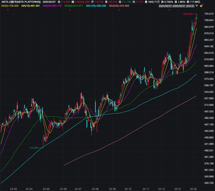 近几年Meta股价走势非常强劲,2024年上涨了66%左右,其中四季度涨了2.37%;2025年以来,Meta年初至今已经涨超22%,该公司大举布局人工智能领域,去年四季度净利润同比增长49%。