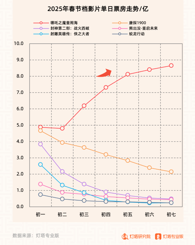 2025年春节档收官,多项数据破影史纪录。《哪吒之魔童闹海》单日票房继续攀升,成为中国影史冠军,超1.2亿人次踏进电影院见证“中国神话宇宙”爆发。