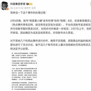 2月8日,@抖音集团李亮 回应封禁张兰、汪小菲账号。