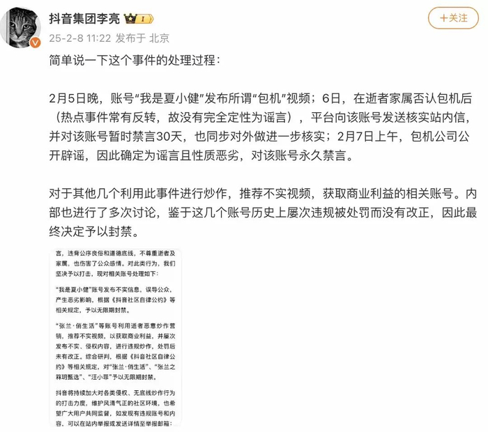 2月5日晚,账号“我是夏小健”发布所谓“包机”视频;6日,在逝者家属否认包机后(热点事件常有反转,故没有完全定性为谣言),平台向该账号发送核实站内信,并对该账号暂时禁言30天,也同步对外做进一步核实;2月7日上午,包机公司公开辟谣,因此确定为谣言且性质恶劣,对该账号永久禁言。