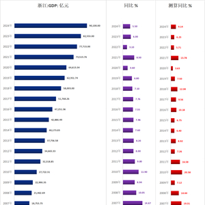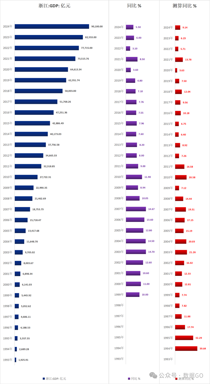 浙江省历年GDP(1993-2024) 市场资讯 2025.02.08 15:49 2024年,浙江省GDP是9.01万亿元,同比增长5.5%。用绝对值测算看,增幅是9.14%,测算值高于公布值。 (转自:数据GO)