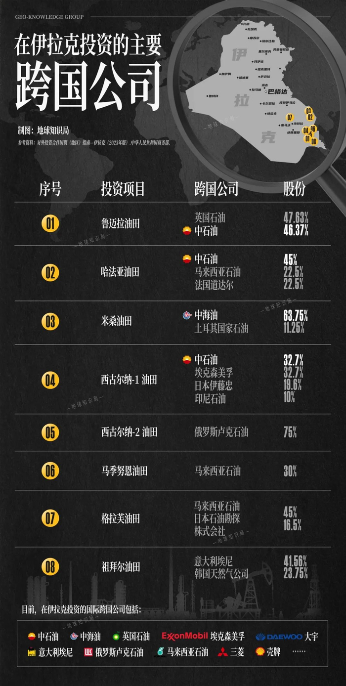 中资石油公司在伊拉克的投资逐年增加,作为作业者或大股东参与了包括哈法亚油田、西古尔纳-1油田、鲁迈拉油田、艾哈代布油田、米桑油田、东巴格达油田、第九区块和斯巴气田等多个项目,在伊拉克的外资能源投资中占据主导地位。