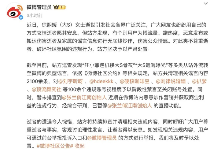 截至目前,站方巡查发现“汪小菲包机接大S骨灰”“大S遗嘱曝光”等多类从站外流转至微博的典型谣言,依据《微博社区公约》等相关规定,站方共清理相关谣言内容2100余条,对@刘宇昕呀 、@hdeekkk 、@硬核咖啡豆 、@刘律说婚姻 、@扒爹 、@顶流颜究社 等100余个违规账号视程度予以阶段性禁言至关闭账号处置。同时,暂未排查到@张兰俏江南创始人 近期在微博站内恶意炒作营销并获取商业利益的违规行为,经综合研判,已暂停@张兰俏江南创始人 的直播功能。