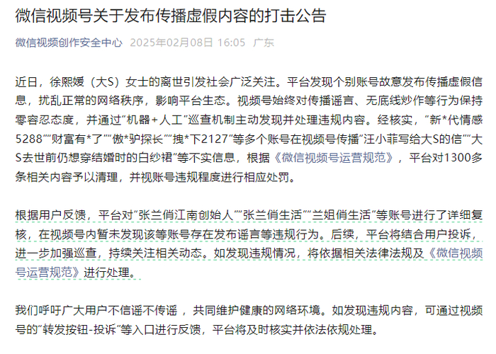 近日,徐熙媛(大S)女士的离世引发社会广泛关注。平台发现个别账号故意发布传播虚假信息,扰乱正常的网络秩序,影响平台生态。视频号始终对传播谣言、无底线炒作等行为保持零容忍态度,并通过“机器+人工”巡查机制主动发现并处理违规内容。经核实,“新*代情感5288”“财富有*了”“傲*驴探长”“拽*下2127”等多个账号在视频号传播“汪小菲写给大S的信”“大S去世前仍想穿结婚时的白纱裙”等不实信息,根据《微信视频号运营规范》,平台对1300多条相关内容予以清理,并视账号违规程度进行相应处罚。