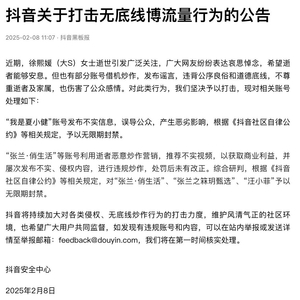 2月8日中午,抖音发布《抖音关于打击无底线博流量行为的公告》,公告显示,张兰、汪小菲抖音被无限期封禁。