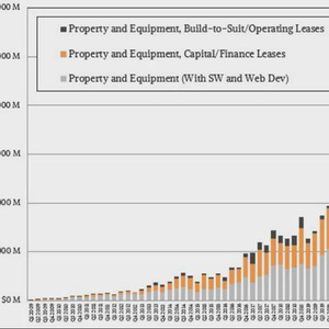 当时,这一比例为每季度数千万美元,随着 AWS 云的增长,这一比例迅速突破数亿美元。自 2008 年第一季度以来,亚马逊已在房地产和设备上投资了 4697 亿美元,这是一个惊人的数字,但如果你考虑到这是亚马逊、微软、谷歌和 Meta Platforms 表示将在本日历年在资本支出上花费的大致数字,你就会发现这笔钱是惊人的。(微软为 800 亿美元,谷歌为 750 亿美元,Meta Platforms 为 650 亿美元,亚马逊为 1000 亿美元。)