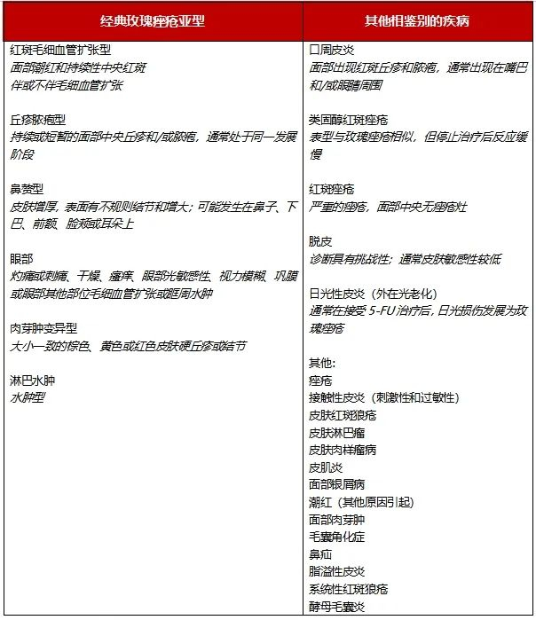 虽然玫瑰痤疮通常可以与寻常痤疮、口周皮炎和/或脂溢性皮炎相鉴别,但它们可以同时发生在同一患者身上。较不常见的鉴别诊断还包括银屑病/皮脂银屑病、刺激性和过敏性接触性皮炎、面部肉芽肿和红斑狼疮。(表2)