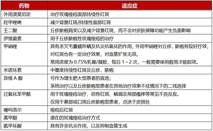 局部治疗是很重要的治疗环节,适用于红斑毛细血管扩张型玫瑰痤疮、轻中度丘疹脓疱型玫瑰痤疮,亦可与其他治疗联合用于重度或难治性玫瑰痤疮。(表3)