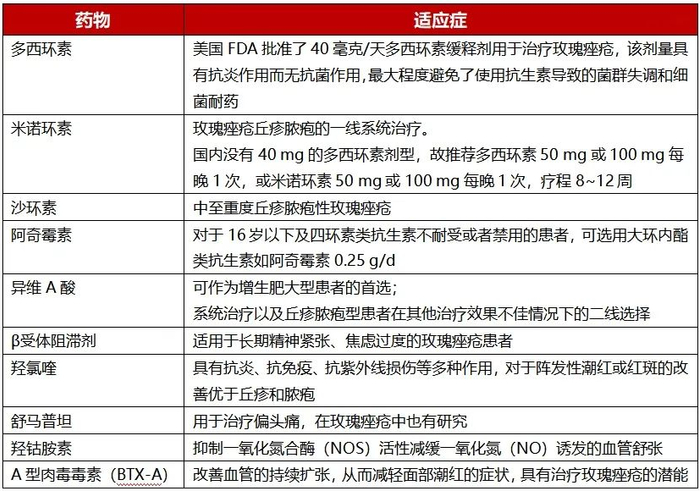 系统治疗已成为中度/重度玫瑰痤疮和局部治疗无效的轻度玫瑰痤疮的主要治疗方法。(表4)