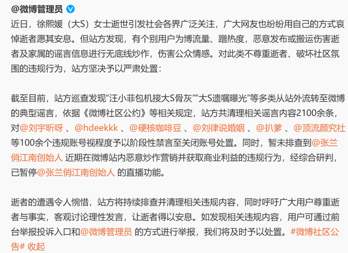 近日,徐熙媛(大S)女士的离世引发社会广泛关注。平台发现个别账号故意发布传播虚假信息,扰乱正常的网络秩序,影响平台生态。视频号始终对传播谣言、无底线炒作等行为保持零容忍态度,并通过“机器+人工”巡查机制主动发现并处理违规内容。经核实,“新*代情感5288”“财富有*了”“傲*驴探长”“拽*下2127”等多个账号在视频号传播“汪小菲写给大S的信”“大S去世前仍想穿结婚时的白纱裙”等不实信息,根据《微信视频号运营规范》,平台对1300多条相关内容予以清理,并视账号违规程度进行相应处罚。