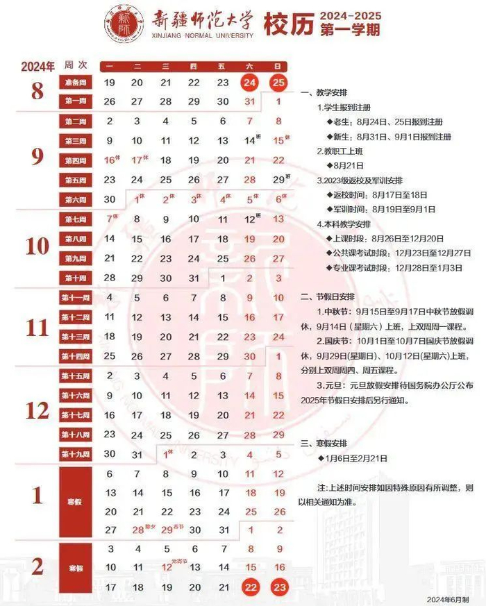 寒假时间:2025年1月6日至2月21日,2月22日、23日报到注册。