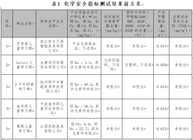 结果显示:15款样品的化学安全指标均能达到标准要求。1款样品无表面涂层,表面涂层可迁移元素项目不适用;其余样品表面涂层可迁移元素均未检出,表面涂层可迁移元素测试结果表现不一,但均在限量范围内。2个样品无纺织面料,纺织面料游离甲醛项目不适用,其余样品均未检出纺织面料游离甲醛。1个样品无塑料,塑料中邻苯二甲酸酯项目不适用,其余样品均未检出塑料中邻苯二甲酸酯。15款样品的甲醛释放量测试结果稍有差异,总挥发性有机物(TVOC)项目测试结果均为未检出。检测结果排名前5的样品详见表1。