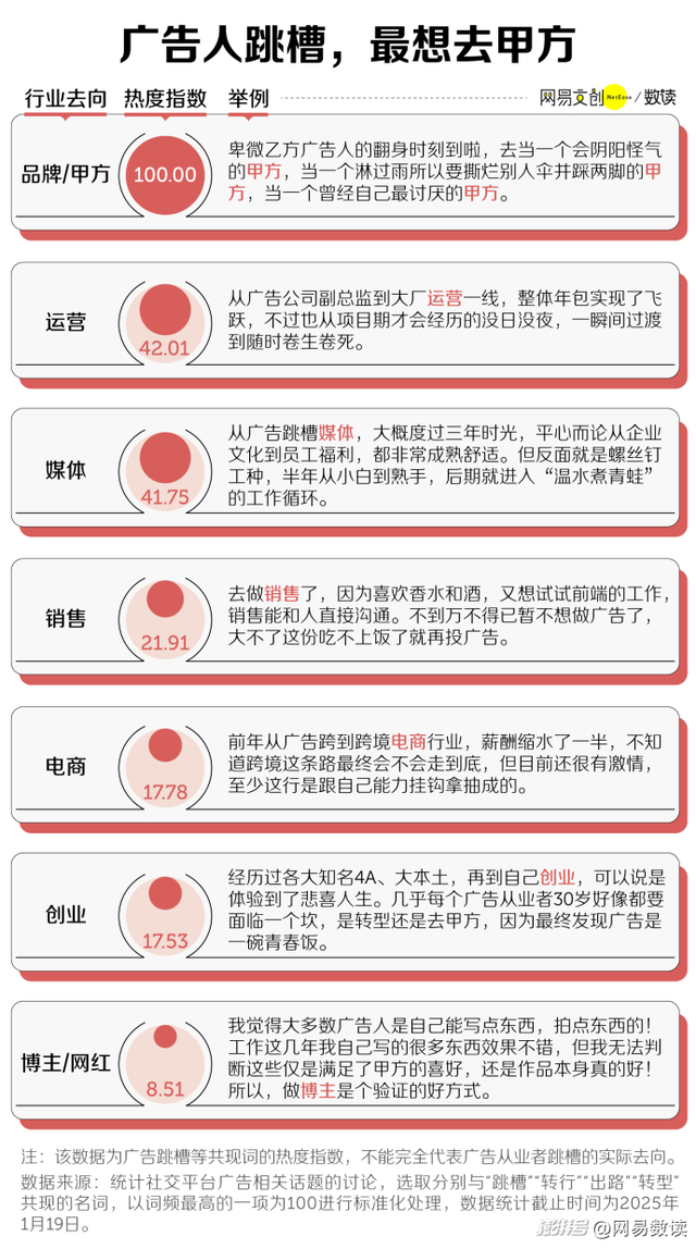 我们统计并分析了社交平台上广告行业工作相关跳槽去向的讨论,发现对于不少广告人来说,跳槽的终极目标是进入甲方公司。